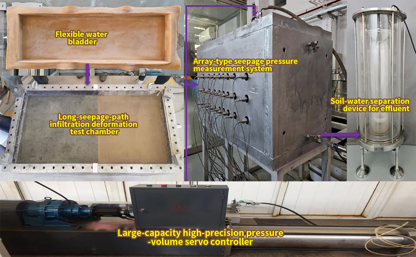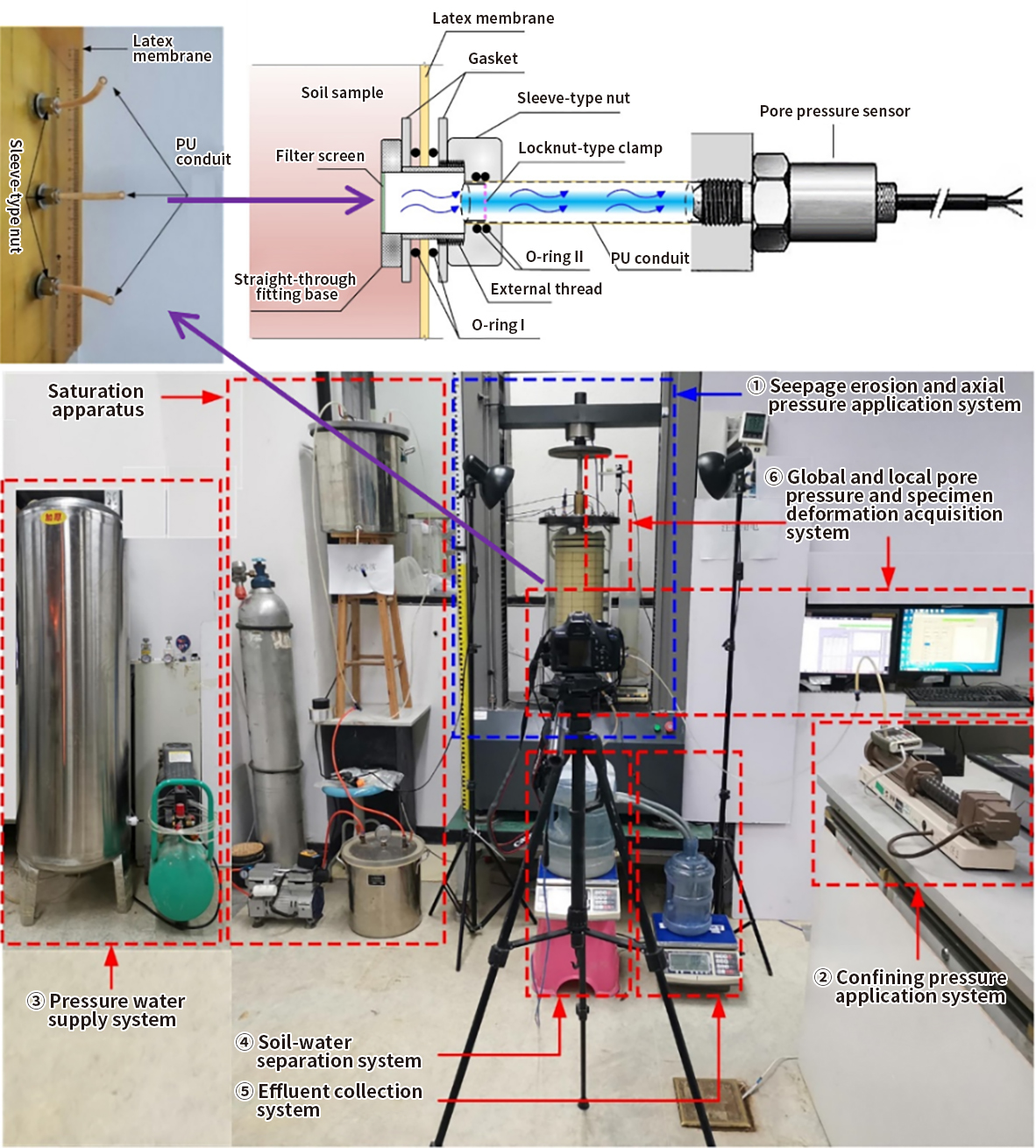 · An "Oreo"-style sleeve osmometer has been developed for sidewall installation on the flexible latex membranes. A soil-water separation technique for seepage deformation tests with controllable outlet hydraulic head has also been established. Furthermore, a triaxial seepage deformation testing system has been innovatively developed to realize the full-scale measurement of deformation, hydraulic gradients, and particle migration.