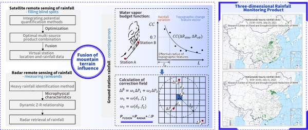 · Having proposed a multi-source rainfall fusion approach that integrates "global products to supplement monitoring blind spots, rainfall radar to capture rainband trends, and ground stations to correct rainfall errors", developed a multi-source rainfall fusion method considering localized rainfall characteristics, and created "space-air-ground" three-dimensional rainfall monitoring products that cover mountainous regions across the country.
