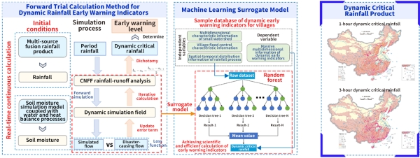 · Having proposed a forward trial calculation method for dynamic rainfall warning indicators that considers soil moisture changes and spatial-temporal heterogeneity of rainfall, and established a sample database of dynamic early warning indicators for villages and a surrogate model based on random forests, increasing the forecast and early warning hit rate to over 75%.
