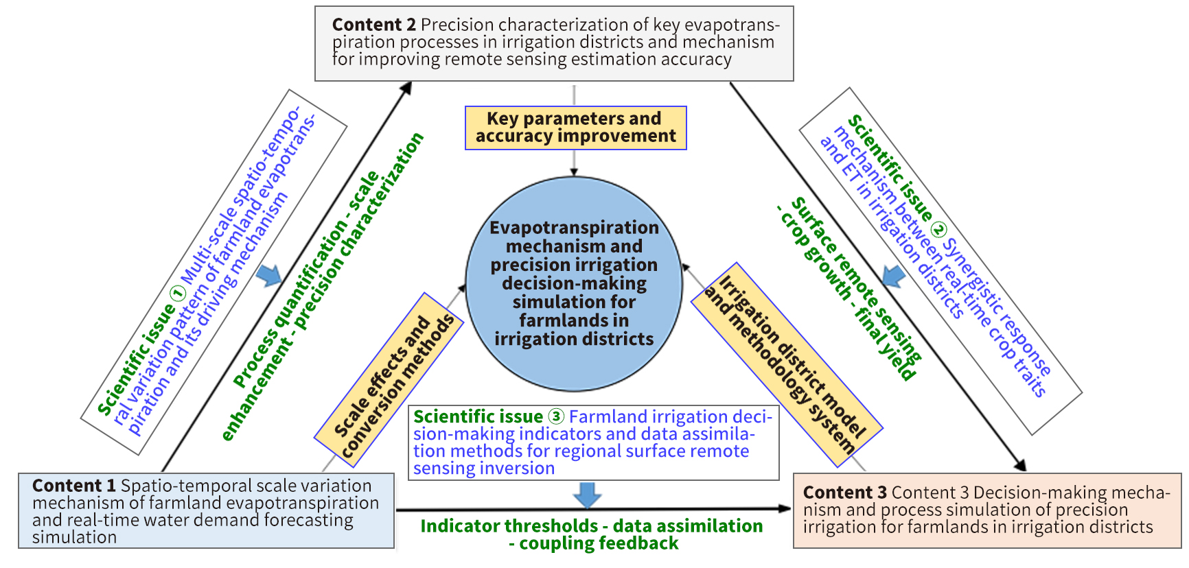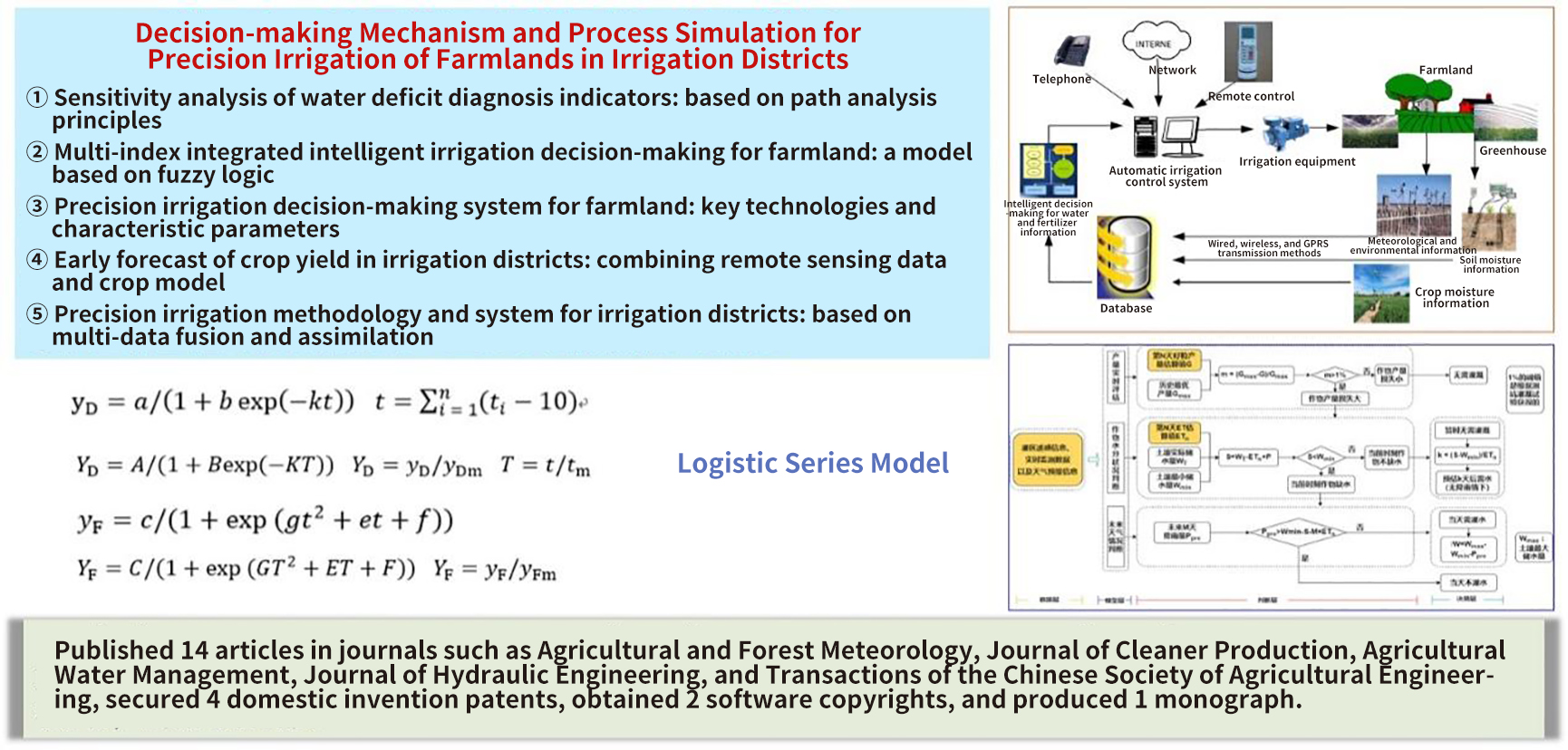 The decision-making network is the core of irrigation district modernization and the precise implementation and realization of digital irrigation districts. The accurate estimation of farmland evapotranspiration and the precision irrigation management system forms the foundation of this decision-making network. Focusing on this pivotal aspect, and with the support of multiple National Natural Science Foundation projects and National Science and Technology Support Program initiatives, relevant scientific research has been conducted for nearly 20 years to explore farmland evapotranspiration mechanism and precision irrigation decision-making simulation in irrigation districts, which has yielded significant results and thus advanced agricultural water conservancy, hydrology, and water resources disciplines.