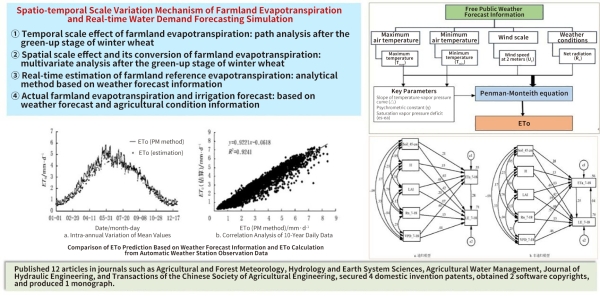 · This work has led the way in agricultural and forest meteorology and evapotranspiration research, with some findings and conclusions being widely recognized and cited both domestically and internationally. It has advanced the development of agricultural water conservancy, hydrology and water resources disciplines, making foundational contributions to the efficient utilization of water resources. The research findings have been published in 44 high-level papers and yielded 13 national invention patents, 7 software copyrights and 2 monographs.
