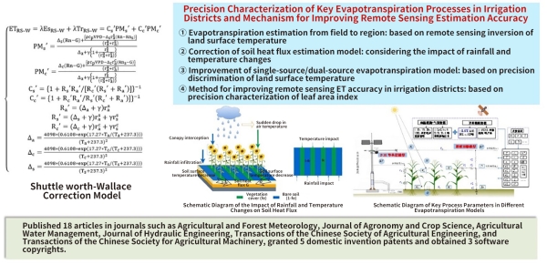 · In response to issues such as ambiguous parameter scaling for remote sensing of evapotranspiration in irrigation districts, insufficiently detailed characterization of process parameters, and the urgent need to improve simulation accuracy, this research has innovated precision characterization methods and models for key parameters in remote sensing inversion of evapotranspiration. It has clarified the mechanisms for enhancing the accuracy of simulation models for remote sensing inversion of evapotranspiration and overcome the issue of inaccurate ET estimation caused by light saturation of vegetation indices during the mid-to-late stages of crop growth. These advancements provide scientific insights for the in-depth development of remote sensing mechanisms for evapotranspiration in irrigation districts.
