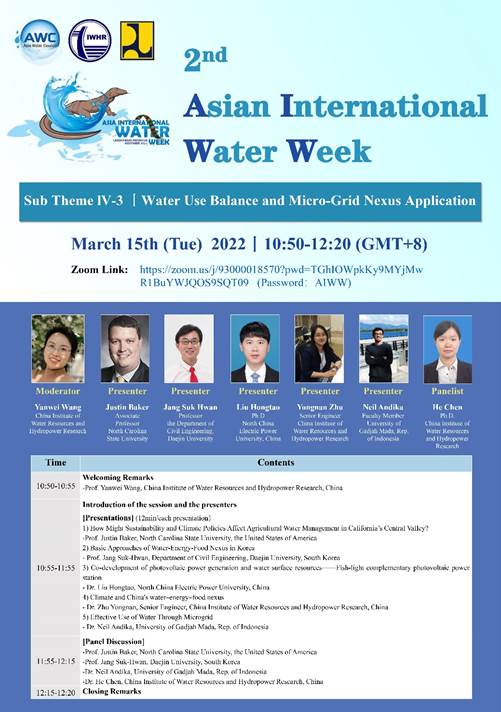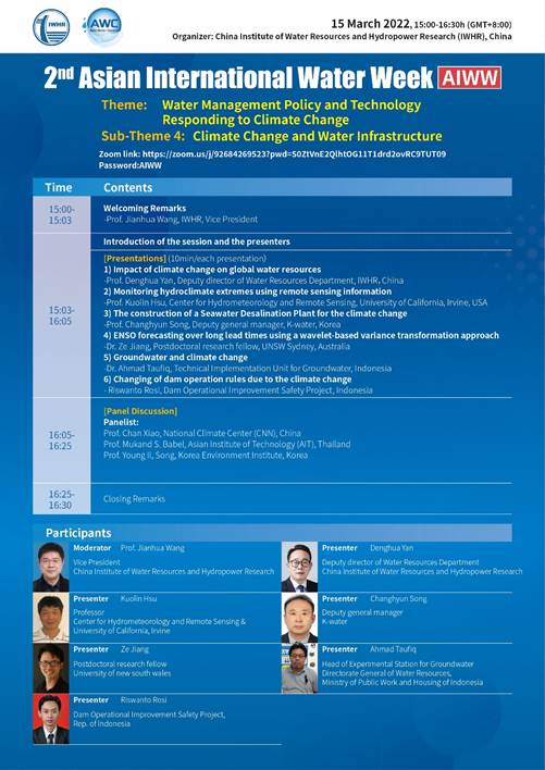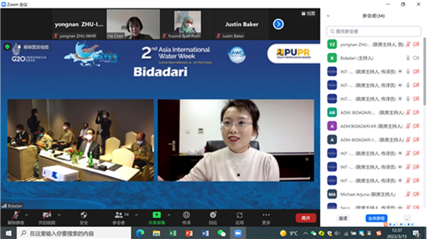 IWHR was actively involved in the 2nd Asian International Water Week (AIWW), held from March 14 to 16, 2022 in Indonesia, by hosting, cohosting or moderating sub-theme sessions, delivering technical presentations or participating in the panel discussions to share the research findings and practical experience of China in terms of water-energy-food nexus, flood resilience of cities, irrigation and poverty alleviation, climate change adaptaion of thhe water sector, etc.