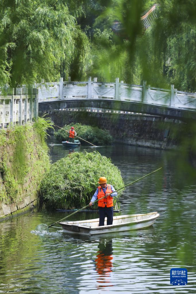 工作人员在重庆永川临江河红旗河段清漂(2022年5月7日摄)。新华社发(刘欢 摄)