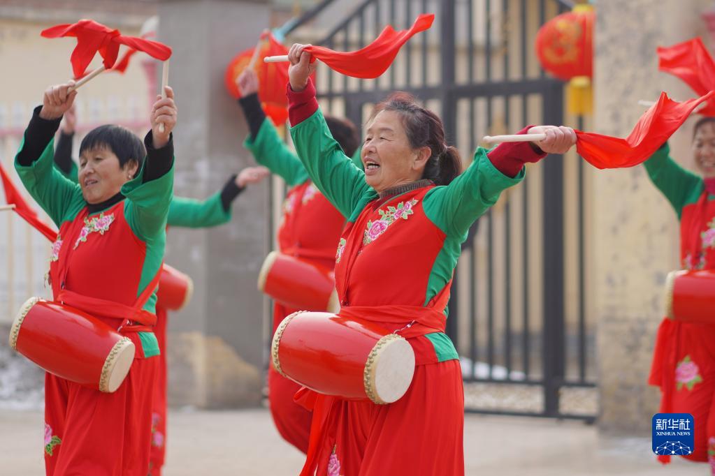 河北省邢台市内丘县史村屯村村民在广场排练腰鼓(2022年1月29日摄)。新华社发(刘继东 摄)